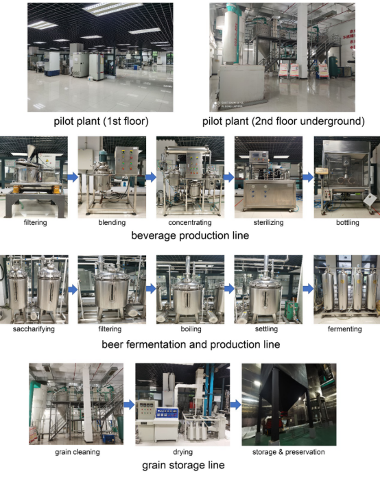 The pilot plant is equipped with various food drying systems, such as hot air circulating oven, spraying dryer, ceramic infrared-hot air combined drying system, and continuous tunnel microwave drying sterilization line, a complete beverage production line, consisting of extraction and concentration system, plate filtering centrifuge, multi-purpose mixing tank, UHT sterilizer, and sterile packing chamber, and a beer fermentation and product line, including saccharifying tank, filtering tank, boiling pot, whirlpool separating tank, fermentation tank, and clean-in-place purge tank, and grain storage and preservation tanks. It is extended further with other supporting equipment and 3 separate rooms for pretreatment and preparation.