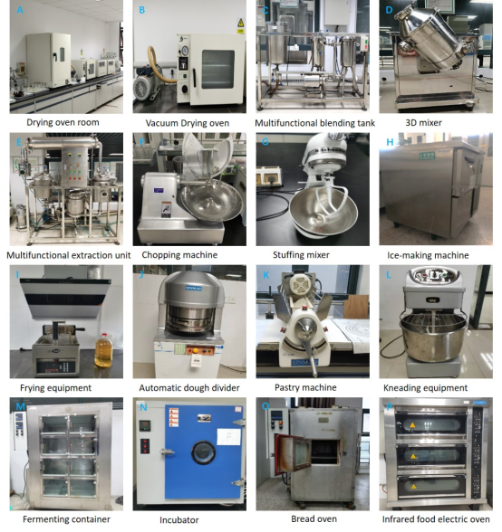 It is equipped with laboratory benches, water bath pots, electronic balances, chopping machines, electric stoves, and other commonly used food processing equipment, and an air conditioner, fume hoods, a water supply, and sinks to meet the required experimental conditions.