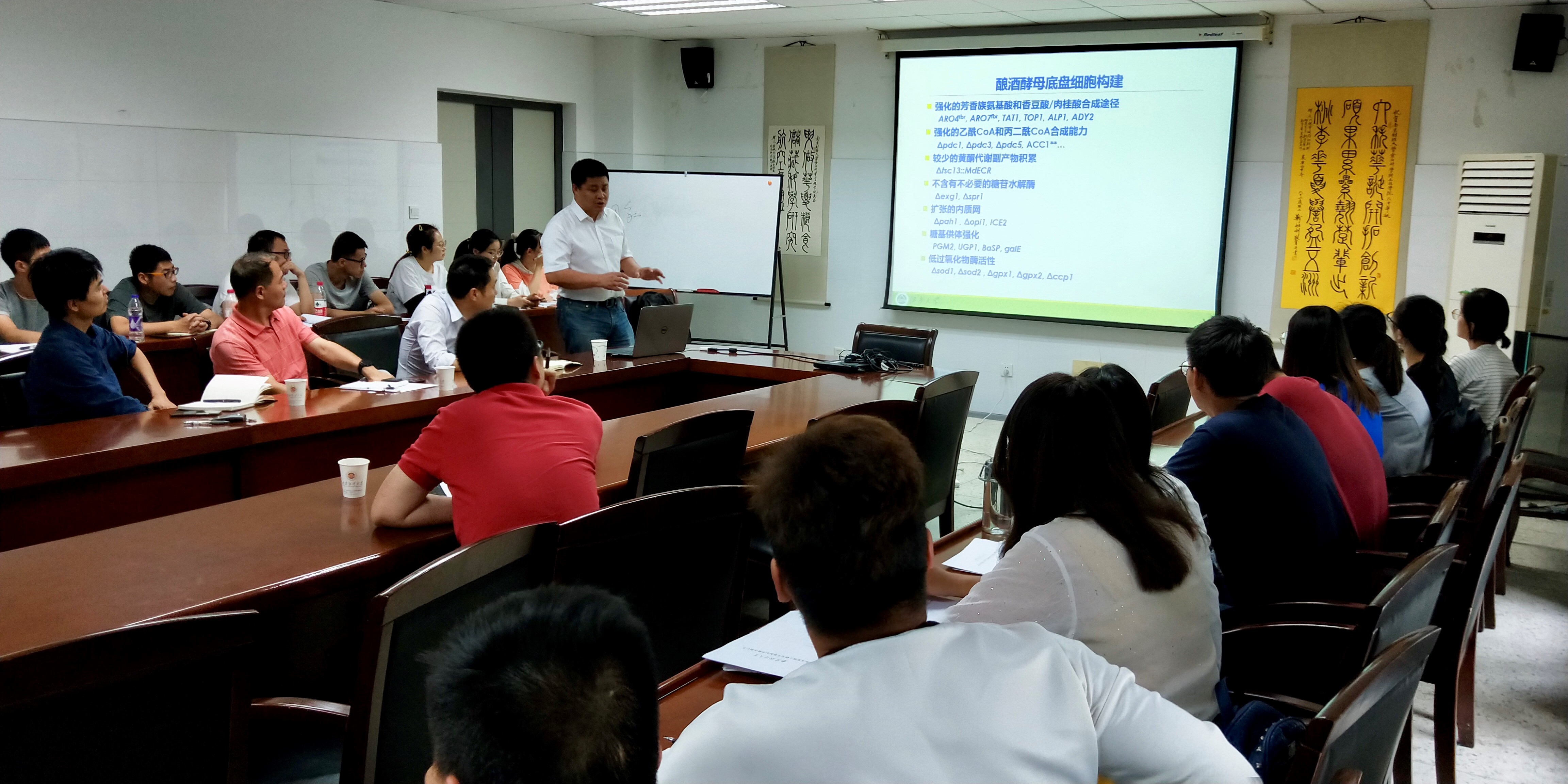合成生物学作为一种具有颠覆性意义的新兴交叉学科,其未来应用前景正越来越多地在学术界和工业界热议。周景文教授从合成基因的挖掘鉴定、植物基因的表达,合成途径平衡调控等方面,解析了如何运用生物合成技术通过微生物发酵高效地积累黄酮类化合物。现场老师们和研究生对合成生物学在食品科学与工程领域的应用产生极大兴趣,积极踊跃地提问并探讨了目前我国急需解决的“卡脖子”技术难题。周景文教授对于老师们和研究生提出的疑惑做出了详细的解答,并分享他申报国家自然科学基金的心得体会。