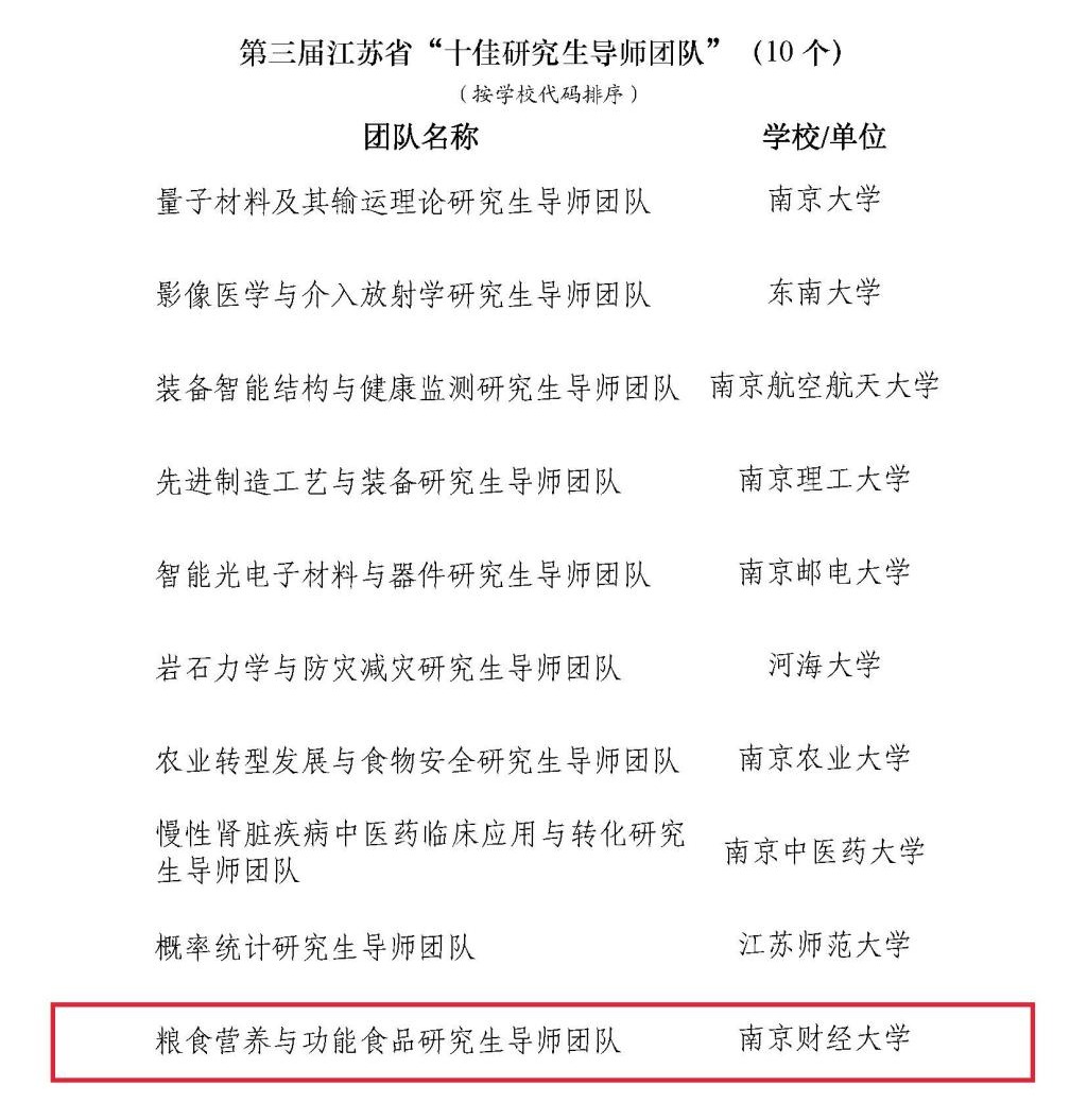 近日,第三届江苏省“十佳研究生导师团队”和“十佳研究生导师”推选结果揭晓。我院粮食营养与功能食品研究生导师团队获江苏省“十佳研究生导师团队”称号。