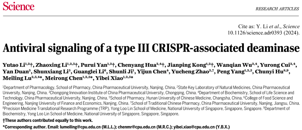 近日,我院青年教师李光磊参与中国药科大学肖易倍教授团队牵头的CRISPR-Cas调控ATP消耗抗病毒机制研究,在国际顶级期刊Science上发表了题为Antiviral signaling of a type III CRISPR-associated deaminase的研究论文,伟德victor1946为论文合作单位。
