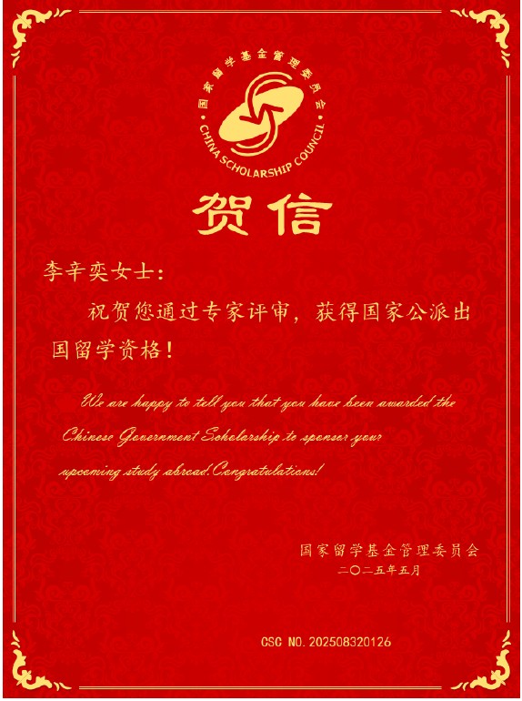 近日,国家留学基金管理委员会公布了2025年国家建设高水平大学公派研究生项目录取名单,我院2022级食品科学与工程学硕士研究生李辛奕同学凭借扎实的专业基础、突出的科研能力以及出色的学术成果,成功入选该项目!李辛奕同学即将前往全球食品科学与工程专业排名第五(2024年软科世界一流学科排名)的美国马萨诸塞大学阿姆赫斯特分校攻读博士学位。
