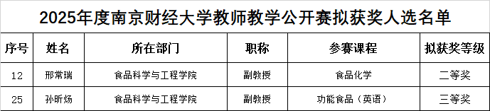 近日,伟德victor19462025年度教师教学公开赛评比结果正式揭晓,我院两位教师凭借出色的教学表现荣获佳绩。其中,邢常瑞老师主讲的《食品化学》课程荣获二等奖,孙昕炀老师主讲的《功能食品(英语)》课程荣获三等奖。