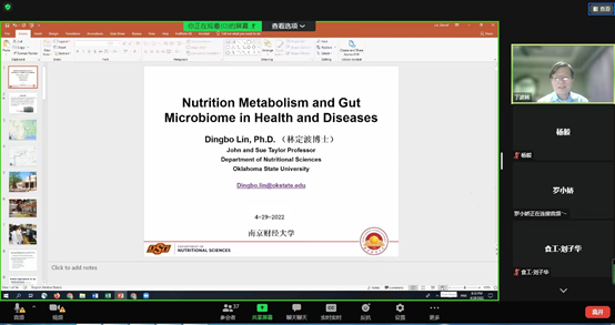 2022年4月29日上午,应我院邀请,俄克拉荷马州立大学的林定波副教授作了题为“Carotenoid metabolism and gut microbiome in health and diseases”的线上学术报告,学院部分教师和研究生参加了此次报告会,报告会由我院沈新春教授主持。