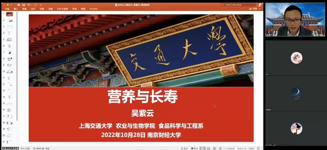 10月28日上午,国家优青、上海交通大学长聘教轨副教授、博士生导师吴紫云应邀作了题为“营养与长寿”的学术报告,本次报告由伟德国际victor1946院长方勇教授主持,学院300余名师生通过线上方式聆听了报告。