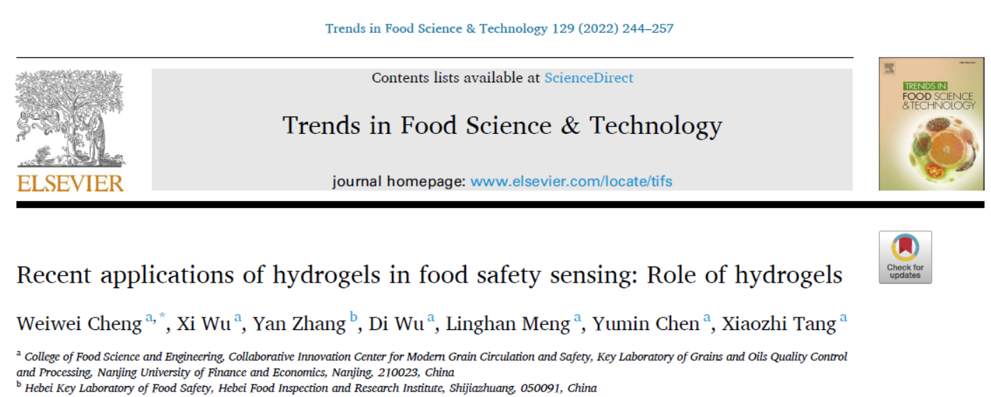 2022年10月9日,伟德国际victor1946汤晓智汤晓智教授课题组与河北食品检验研究院张岩研究员联合在食品国际顶尖学术刊物《Trends in Food Science & Technology》(Q1,IF=16.002)发表题为 “Recent applications of hydrogels in food safety sensing: Role of hydrogels” 的综述论文。该论文以伟德victor1946为第一单位,程玮玮博士为第一作者。该项研究工作得到了国家重点研发计划、江苏省高等学校自然伟德国际面上项目、南京市留学人员科技创新项目及江苏省高校优势学科建设工程项目的资助。