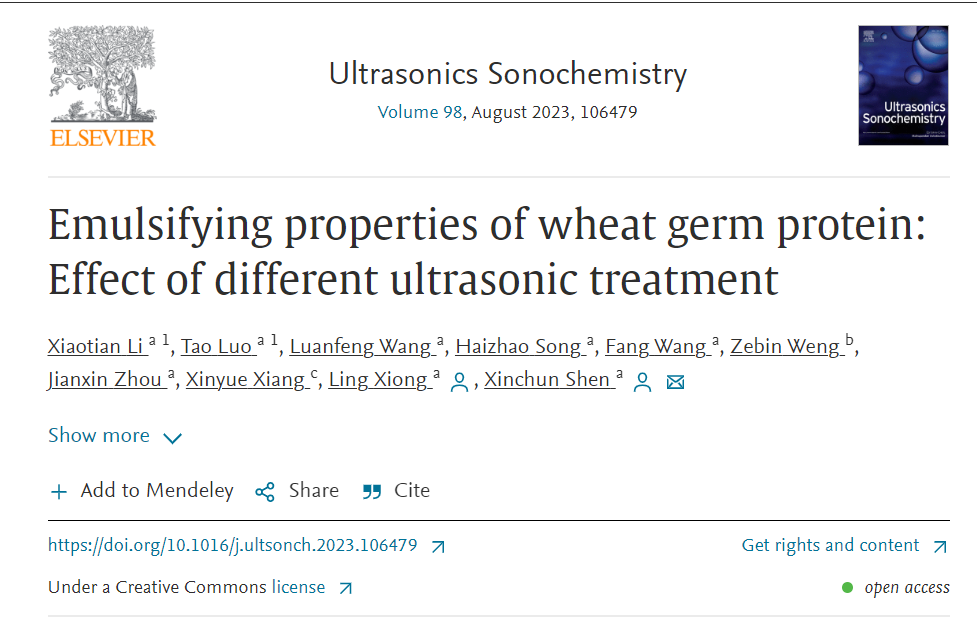 2023年8月1日,伟德国际victor1946沈新春、熊玲(通讯作者)在国际TOP期刊Ultrasonics Sonochemistry(Q1,IF: 8.4)发表题为“Emulsifying properties of wheat germ protein: Effect of different ultrasonic treatment”的研究性论文。
