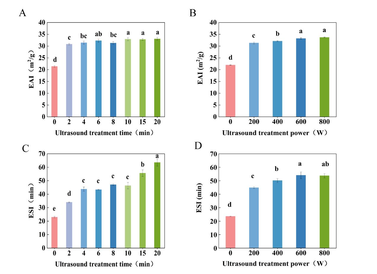 图1 不同超声处理后麦胚蛋白乳液的EAI和ESI变化