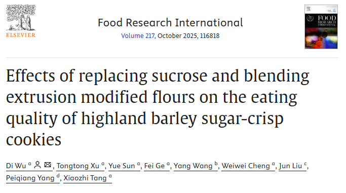近期,伟德国际victor1946吴迪副教授在国际食品TOP期刊Food Research International (Q1, IF=7.0)发表题目为“Effects of replacing sucrose and blending extrusion modified flours on the eating quality of highland barley sugar-crisp cookies”的研究性论文。