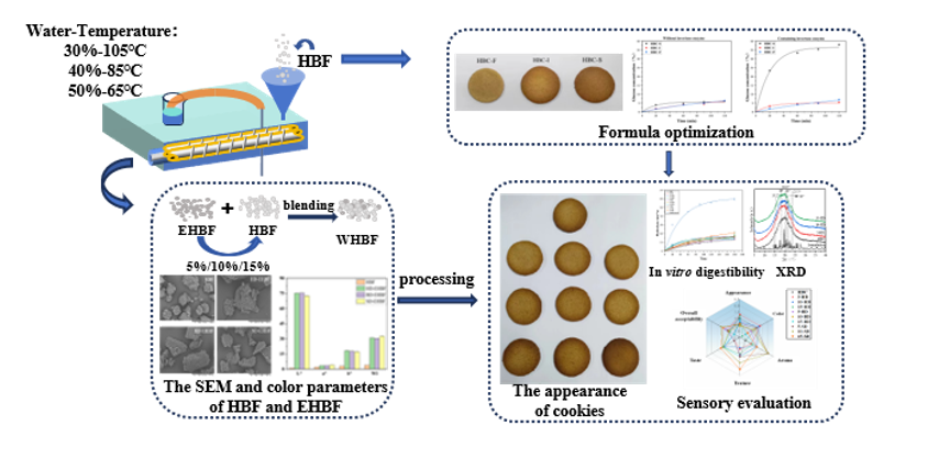 青稞作为青藏高原的特色粗粮作物,因其高膳食纤维和生物活性物质,具有降低血糖、胆固醇以及预防心血管疾病等健康功效。但制品的口感粗糙、加工难度较大,一定程度上限制其在全谷物烘焙食品领域的应用。糖脆饼干是一种方便、广受欢迎的烘焙食品,通常含有大量糖、油脂,且赖氨酸和膳食纤维含量低,不符合现代健康饮食发展趋势。而低GI(血糖生成指数)食品的需求日益增长。挤压改性作为一种先进的食品加工技术,可以通过调控挤压条件来选择性地增强产品的质地、味道和消化特性,并延长产品的保质期。本研究旨在通过饼干配方改良和挤压改性青稞粉的回填策略联用,制备高品质的全青稞糖脆饼干,通过研究三种类型改性粉对产品品质和淀粉结构的影响,指导全谷物烘焙制品加工。