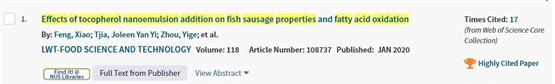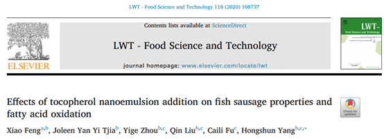 包埋维生素E的纳米乳液在鱼肠中的添加可以有效延缓鱼肉肠内油脂的氧化,并且对其中的不饱和脂肪酸起到保护作用。相比较而言,微米级的维E乳液添加对于鱼肠的脂肪氧化并没有显著的抑制作用。纳米乳液具有粒径小、分布均匀且较稳定的性质,促使维生素E发挥了显著的抗氧化作用。与此同时,研究发现纳米乳液的添加并不影响鱼肠的质构及色泽,可以广泛应用于食品工业生产中。相关研究结果以“Effects of tocopherol nanoemulson addition on fish sausage properties and fatty acid oxidation”为题发表在LWT杂志上,并入选农业科学领域ESI高被引论文。我院冯潇博士为第一作者,新加坡国立大学杨宏顺教授为通讯作者。