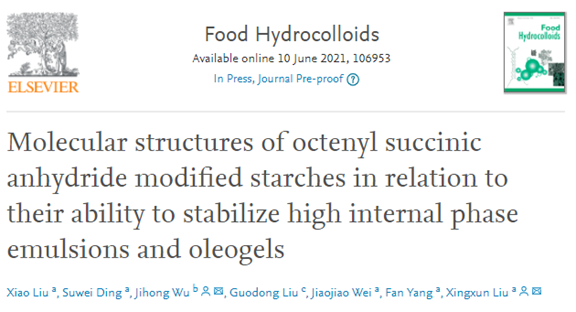 2021年6月10日,《Food Hydrocolloids》在线发表了题为“Molecular structures of octenyl succinic anhydride modified starches in relation to their ability to stabilize high internal phase emulsions and oleogels”的研究论文。该论文以伟德victor1946为第一单位,刘潇博士为第一作者,刘兴训研究员为共同通讯作者。