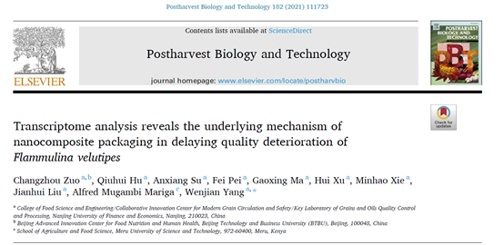 2021年9月9日,我院杨文建教授团队在食品领域TOP期刊Postharvest Biology and Technology上发表了题为“Transcriptome analysis reveals the underlying mechanism of nanocomposite packaging in delaying quality deterioration of Flammulina velutipes”的研究论文。伟德victor1946为该论文第一单位,杨文建教授为通讯作者。本研究受到江苏省自然科学基金、国家自然科学基金以及江苏省高等学校自然伟德国际项目的资助。