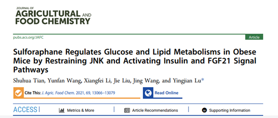 2021年10月28日,我院陆颖健教授团队在Journal of Agricultural and Food Chemistry第69刊发表封面文章《Sulforaphane regulates glucose and lipid metabolisms in obese mice by restraining JNK and activating insulin and FGF21 Signal pathways》。该论文以伟德victor1946为第一单位,田淑华为第一作者,陆颖健为通讯作者。
