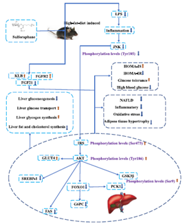 萝卜硫素是一种从十字花科植物中提取的异硫氰酸盐, 具有抗癌、抗氧化、预防肥胖和糖尿病的作用, 但其调节糖脂代谢, 改善肥胖诱导的代谢综合症的机制仍未深入的研究。我们的研究结果表明萝卜硫素主要是通过降低血液中的 LPS (脂多糖) 来缓解炎症的释放从而抑制JNK (c-Jun氨基端激酶) 的磷酸化, 导致JNK的阻断。JNK的失活会增加IRS (胰岛素受体底物) 的酪氨酸磷酸化位点, 从而促进AKT (Ser473) (蛋白激酶B) 的磷酸化来激活胰岛素信号通路。胰岛素信号通路的激活可以通过促进GSK3β (Ser9) (糖原合成酶激酶3β) 的磷酸化来促进肝糖原合成、抑制 G6PC (葡萄糖-6-磷酸酶) 、PCK1 (磷酸烯醇式丙酮酸羧激酶1) 和FOXO1酶的活性来抑制肝脏糖异生,同时降低SREBP-1(固醇调节元件结合蛋白-1) 和FAS (脂肪酸合成酶) 酶的活性来减少脂质合成。此外萝卜硫素也可以通过缓解FGF21 (成纤维细胞生长因子21) 抵抗来缓解肥胖。我们的研究结果可能为代谢综合征患者的症状缓解及维持能量稳态提供一种潜在有效的方法。