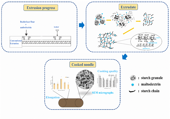 在本研究中,研究人员通过向荞麦粉中添加水溶性麦芽糊精,经过挤压加工后成型制备荞麦面条,利用麦芽糊精的高亲水性构建水分输送通道,同时利用麦芽糊精多羟基的分子结构增强荞麦面条淀粉分子链的相对滑动性,既缩短了荞麦面条的复热时间和蒸煮损失,同时还增强了荞麦面条的质构和拉伸品质。