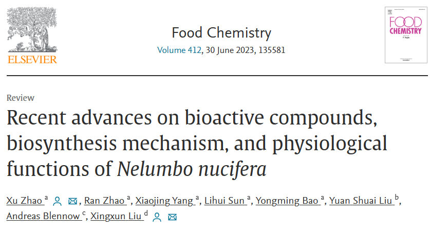 2023年1月27日,大连理工大学赵旭博士(第一作者、通讯作者)与伟德victor1946刘兴训研究员(通讯作者)在国际期刊《Food Chemistry》(JCR一区,IF=9.231)上发表题为“Recent advances on bioactive compounds, biosynthesis mechanism, and physiological functions of Nelumbo nucifera”的高水平综述。