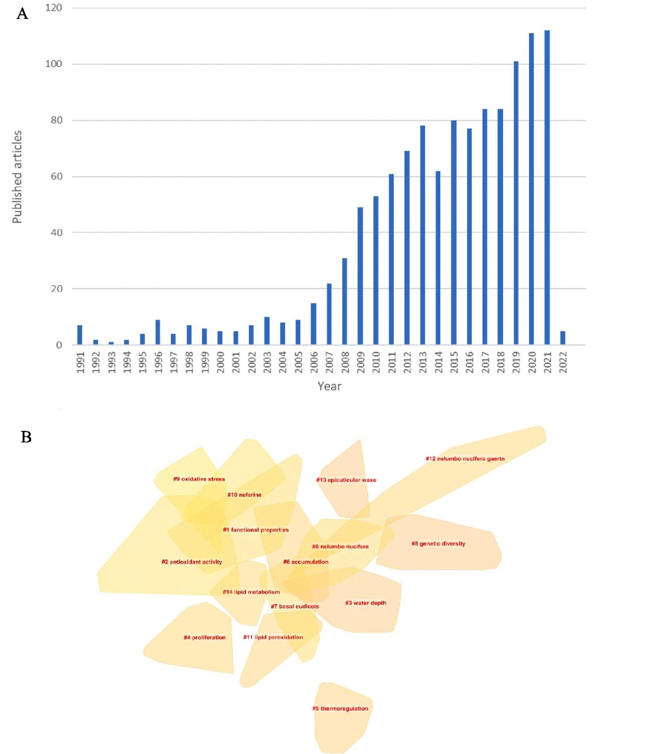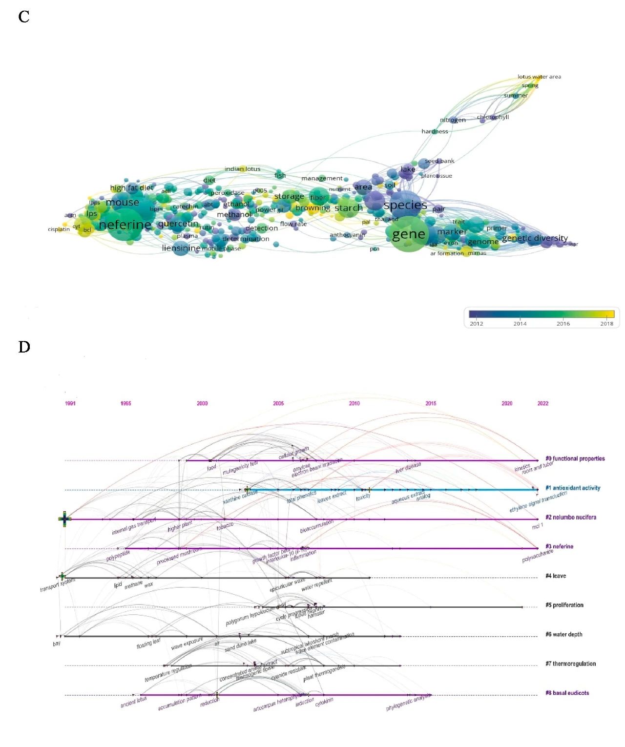 图1 Web of Science检索1960 - 2022年荷花相关文献计量学分析:(A)1990 - 2020年荷花相关文献数量、(B)关键字聚类分析、(C)关键词共现分析、(D)关键字时区分析