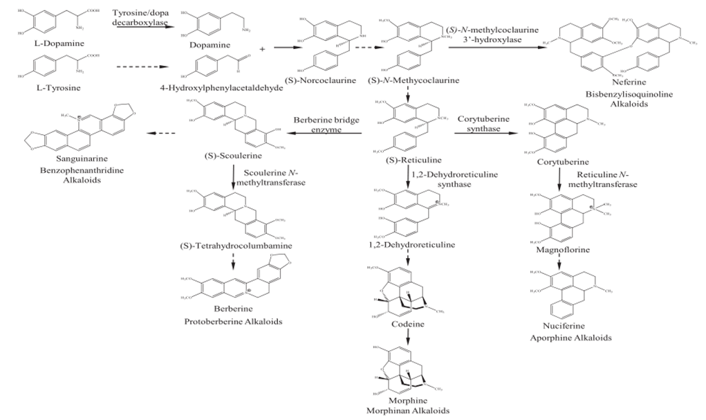 图5 苄基异喹啉类生物碱的生物合成方案