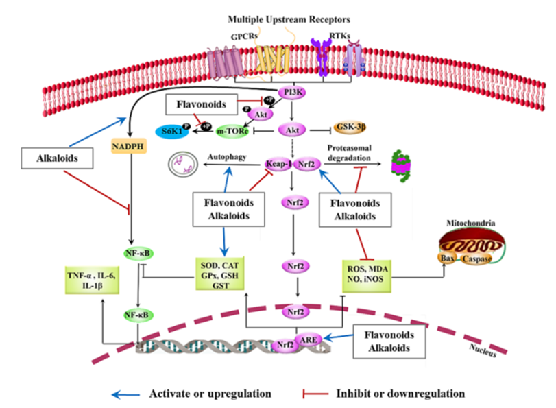 图8 PI3K/AKT通路及黄酮类和生物碱靶向的相互关联通路