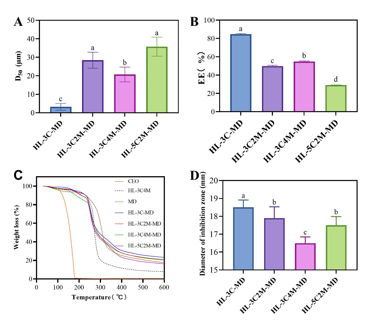 Fig. 3. A: Particle size of microcapsules; B: Encapsulation efficiency of microcapsules; C: TG curves of microcapsules; D: Antimicrobial diameter of microcapsules (S. aureus).