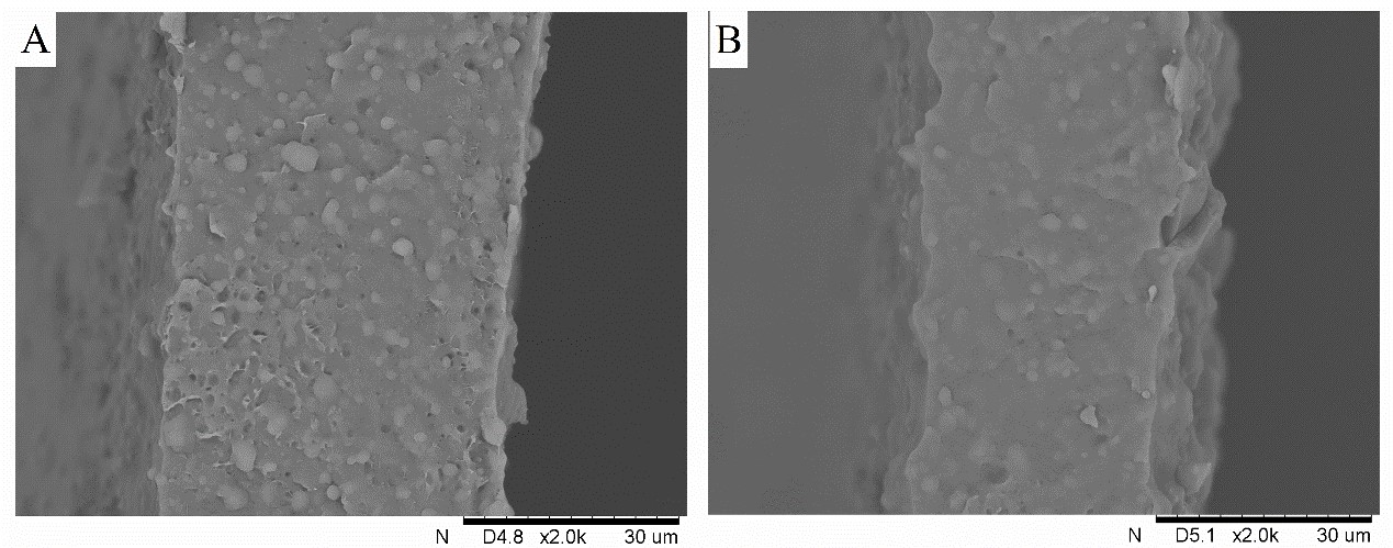 Fig. 4. SEM images of films (a: SP film; b: HL-3C-MD-SP film).