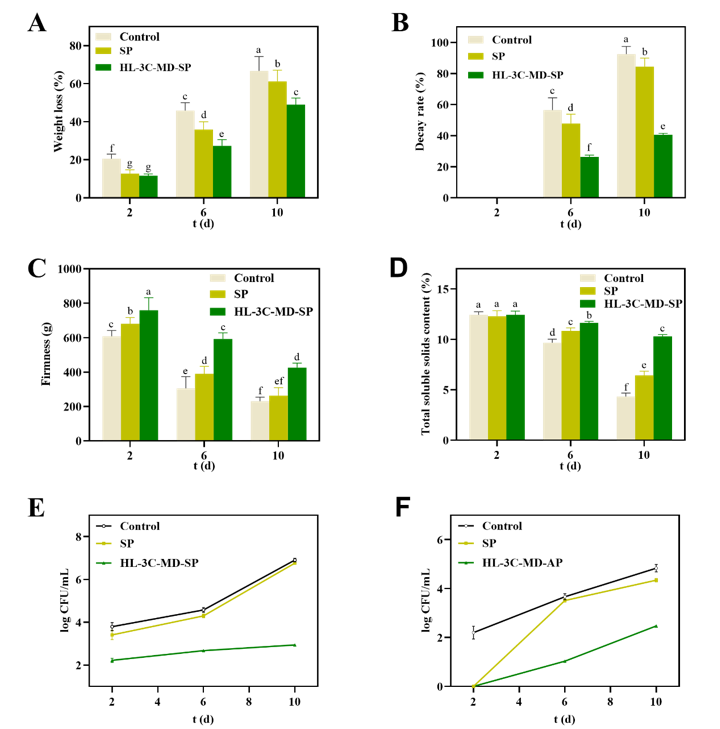 Fig. 7. A: Weight loss; B: Decay index; C: Firmness; D: TSS of strawberries during storage; Total number of colonies (E) and molds (F) of strawberries during storage. Different lowercase letters indicate significant differences (p < 0.05).