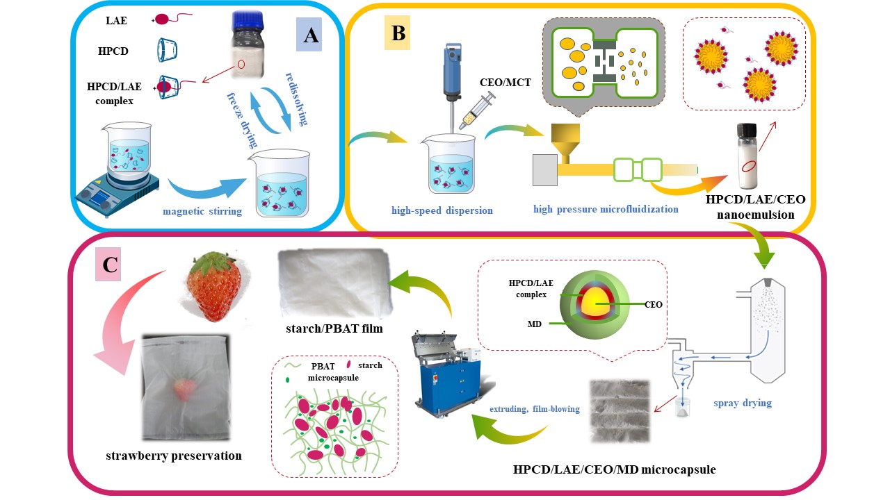 Fig. 1. Schematic illustration for the preservation of strawberry with starch/PBAT films containing HPCD/LAE/CEO/MD microcapsules. A: The preparation of the HPCD/LAE complex; B: The preparation of HPCD/LAE/CEO/MD nanoemulsions; C: The preparation of HPCD/LAE/CEO/MD microcapsules and the starch/PBAT films containing microcapsules.