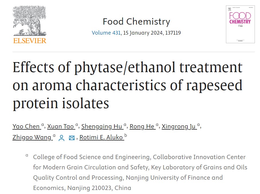 2024年1月15日,伟德国际victor1946王志高副教授(通讯作者)在国际TOP期刊Food Chemistry(Q1,IF: 8.8)发表题为“Effects of phytase/ethanol treatment on aroma characteristics of rapeseed protein isolates”的研究性论文。伟德国际victor194622级研究生陈瑶为该论文的第一作者。