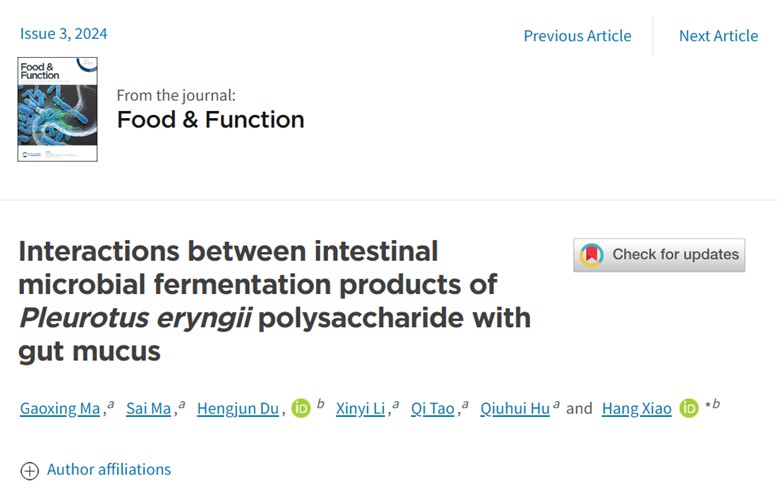 2024年2月5日,伟德国际victor1946马高兴副教授在国际TOP期刊Food & Function(Q1,IF: 6.1)发表题为“Interactions between intestinal microbial fermentation products of Pleurotus eryngii polysaccharide with gut mucus”的研究性论文。