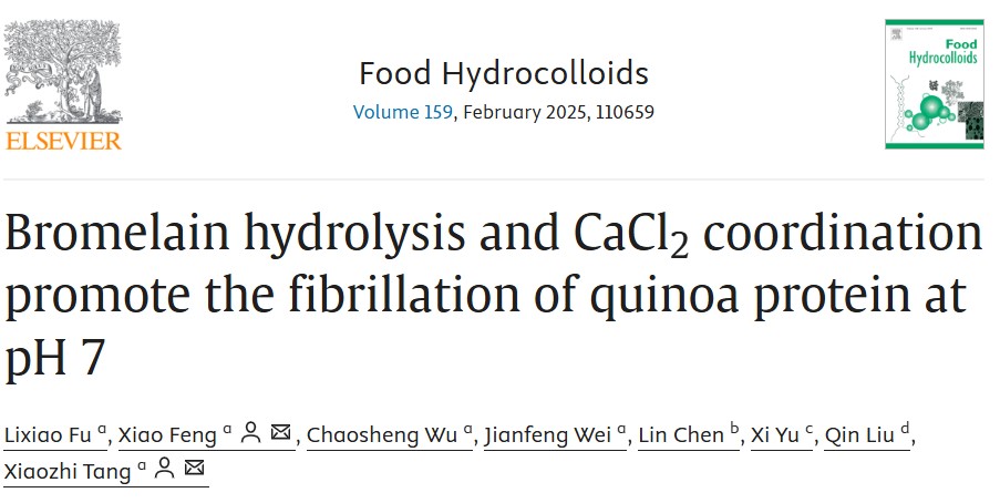 近期,伟德victor1946汤晓智教授、冯潇副教授在国际食品TOP期刊Food Hydrocolloids (Q1, IF=11.0)发表题目为“Bromelain hydrolysis and CaCl2 coordination promote the fibrillation of quinoa protein at pH 7”的研究性论文。