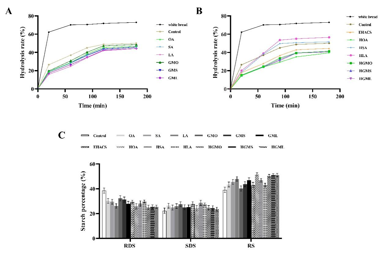 Fig.5. In vitro hydrolysis curve of extruded buckwheat noodles without high-amylose corn starch (A) and with high-amylose corn starch (B), starch percentage of extruded buckwheat noodles (C).