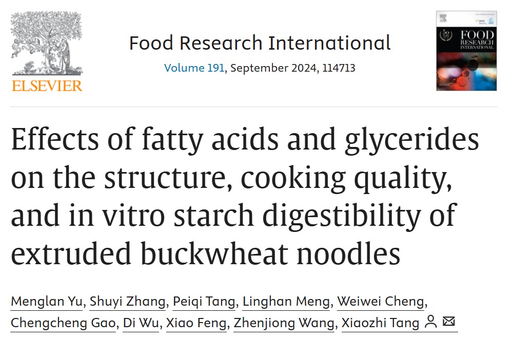 近期,伟德victor1946汤晓智教授团队在国际食品TOP期刊Food Research International (Q1, IF=7.0)发表题目为“Effects of fatty acids and glycerides on the structure, cooking quality, and in vitro starch digestibility of extruded buckwheat noodles”的研究性论文。