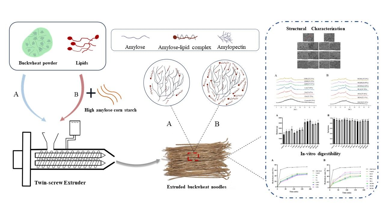 荞麦是一种营养十分丰富的伪谷类作物,但由于缺乏面筋蛋白,利用传统小麦面条加工方式难以生产全荞麦面条。目前,挤压加工已被成功用于制备全荞麦面条。然而,挤压加工涉及的高温和高剪切降低了抗性淀粉含量,提高了淀粉对酶的敏感性,导致预测血糖生成指数升高,与当前健康低糖食品的趋势相悖。直链淀粉-脂质V型复合物是一种被广泛认可并接受的抗性淀粉,能有效降低淀粉消化率,调节血糖水平。在加工或储存过程中,淀粉与脂质可能形成复合物,同时也会影响淀粉的流变性、重结晶、体外酶消化和体内消化等特性。基于此,本研究通过添加不同链长和不饱和度的脂肪酸及其甘油酯以及部分添加高直链玉米淀粉制备挤压荞麦面条,探究其对挤压荞麦结构、蒸煮品质及体外淀粉消化特性的影响。