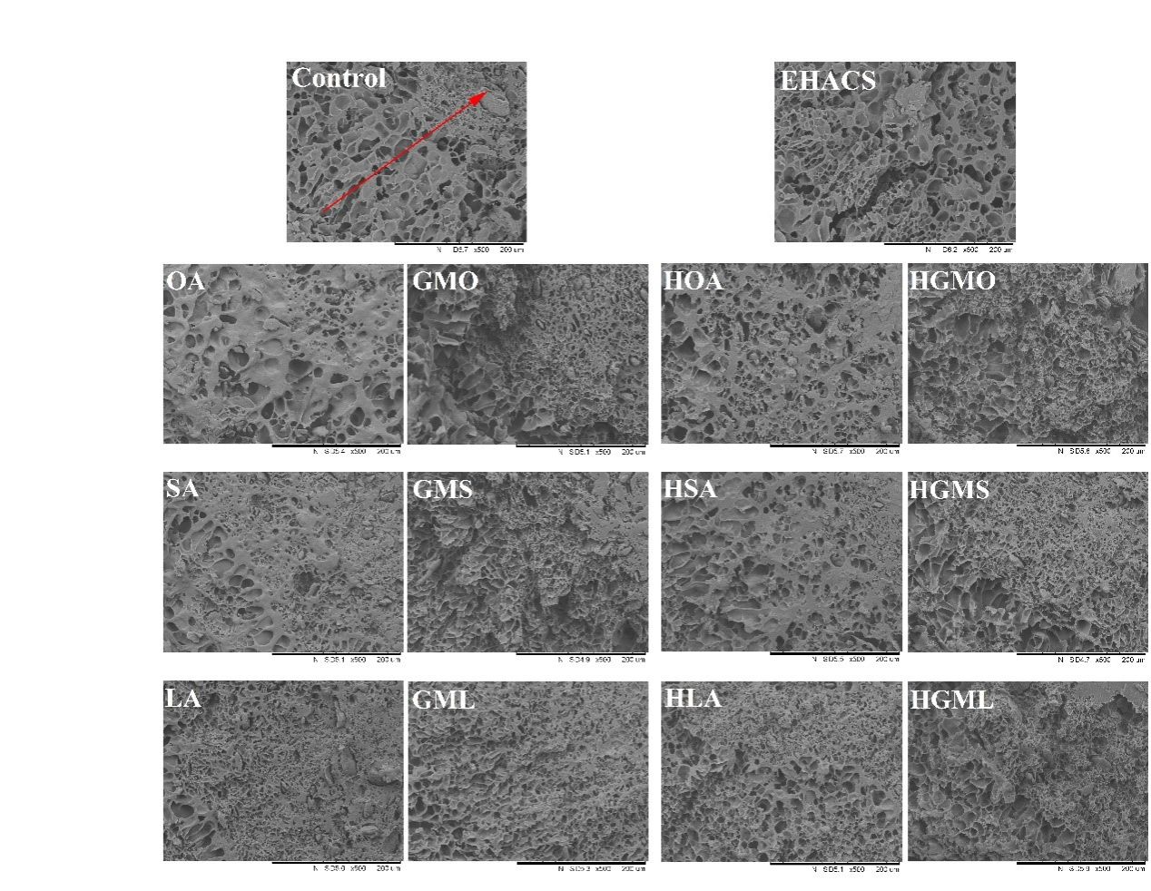 Fig.4. Effects of lipids and high-amylose corn starch on extruded buckwheat noodles microstructure.