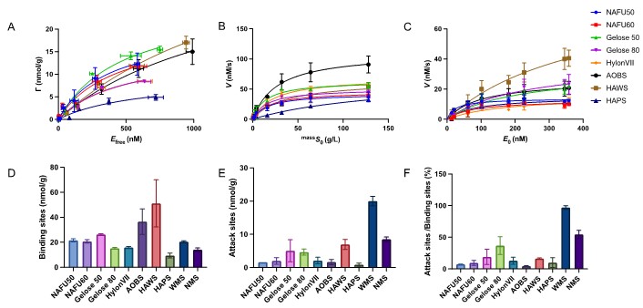 本研究选取来源于玉米、大麦、小麦和马铃薯的8种高直链淀粉,以葡萄糖淀粉酶(GA)为模型酶,创新性地应用界面酶动力学方法,系统解析了酶在淀粉颗粒界面的作用行为。通过定量表征酶的结合位点密度、催化位点密度、催化周转率及酶-底物亲和力,并结合FTIR-ATR、扫描电子显微镜(SEM)、共聚焦激光扫描显微镜(CLSM)及表面链长分布分析,建立了颗粒表面结构与界面催化动力学之间的关联。研究表明,高直链淀粉的酶解抗性主要来源于催化位点密度的降低,而非传统认知中的物理可及性限制。进一步分析发现,不同HAS之间抗性差异的本质在于酶-底物亲和力对催化周转率的调控作用。本研究首次将Sabatier原理引入淀粉颗粒界面催化体系,揭示酶活性与亲和力之间呈“火山型关系”:适中的酶-底物相互作用可实现最优催化效率,而过强或过弱的结合均会抑制反应进行。