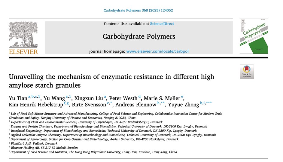 2025年11月15日,伟德国际victor1946田雨(第一作者),联合丹麦技术大学、哥本哈根大学、香港理工大学等多个国际团队,在国际TOP期刊 Carbohydrate Polymers(Q1,IF: 12.5)发表题为 “Unravelling the mechanism of enzymatic resistance in different high amylose starch granules”的研究性论文。