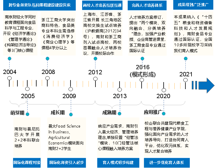 伟德victor1946和浙江工商大学,同根同源,曾属国内贸易部,具有共同的财经育人特质和产业管理优势。早在2004年,伟德victor1946就认识到“现代商业思维能力”和“经济管理能力”对于以培养“技术能力”为主的工科专业同等重要,开始探索食品专业人才的经管素质教育。2012年,学校面向现代食品产业需求,与浙江工商大学签署校际合作协议,践行服务国家战略和长三角教育创新的使命担当,确立为世界一流食品企业培养“技术优秀,兼具经管能力的高素质复合型人才”的育人理念,联合对课程设置、平台建设、专业内容、机制保障等人才培养方面进行改革。经过10余年历程,逐步建立并完善了应用研究型大学的高素质复合型食品专业人才的特色工程教育模式(图1)。截至目前,本成果已在北京工商大学等多所高校推广应用,对同类院校食品专业建设的方向的发展起到引领示范作用。